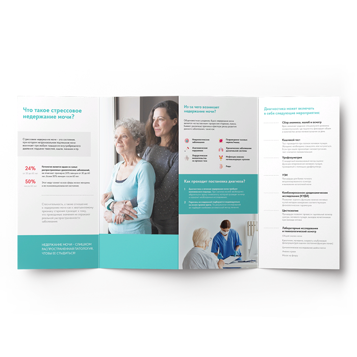 Заказчик предоставил необходимый текст и пожелания к дизайну – использовать розовый и бирюзово-зеленый цвета. В ходе работы подобрали фотографии, иллюстрации, иконки, напечатали баннер для ролл-апа и брошюры тиражом 300 штук.