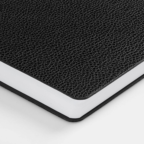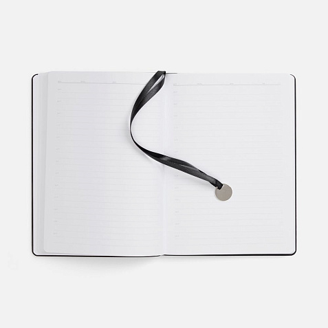 Ежедневник с гибкой обложкой, выполнен из материала La Fite, черный АА, дополнен ляссе в цвет обложки с металлическим шильдом.