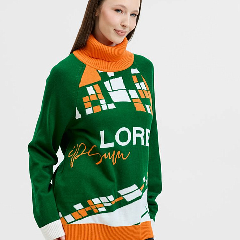 Модель: джемпер, модель унисекс, рукав — реглан, полочка — жаккард, 2–3 цвета нитей, спинка и рукава однотонные — кулирная гладь.