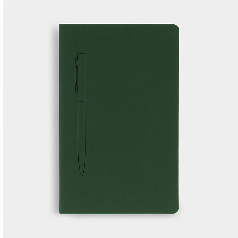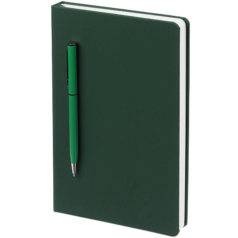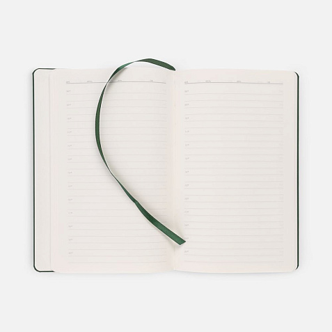 Ежедневник в твердой обложке, выполненной из материала Soft Touch, зеленый FF, дополнен цветным ляссе и магнитом, удерживающим ручку.