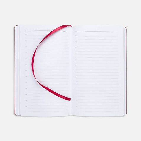 Ежедневник с твердой обложкой, выполнен из материала LaFite, красный РР, дополнен резинкой с металлическим прямоугольным шильдом и ляссе в цвет обложки.
