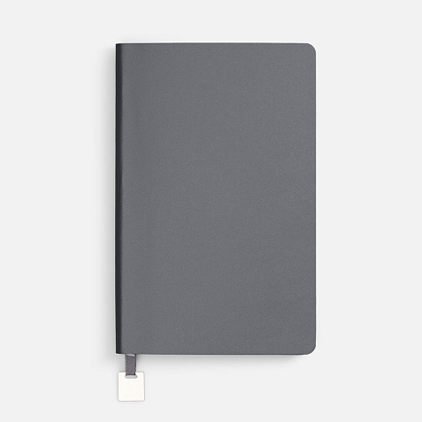 Ежедневник с гибкой обложкой, выполнен из материалов Soft Touch Pearl, серый СС, и Latte, серый (внутренняя часть обложки), дополнен ляссе в цвет обложки с металлическим шильдиком.