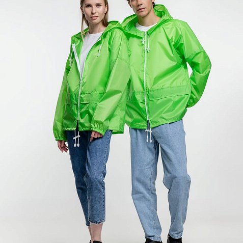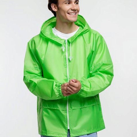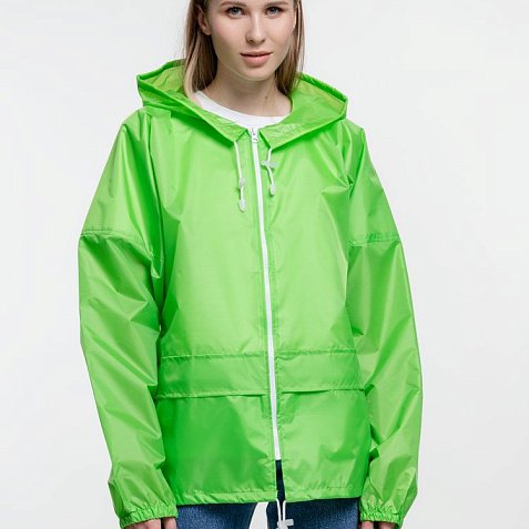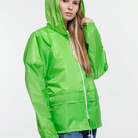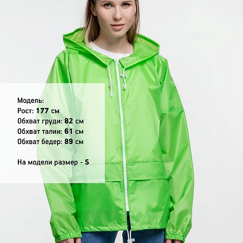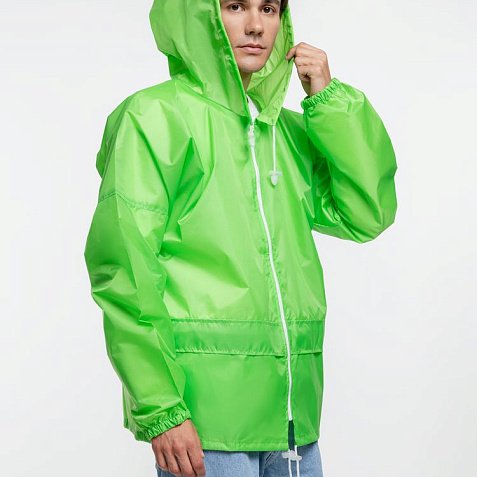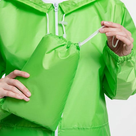Укороченный дождевик свободного кроя из ткани таффета с влагозащитным покрытием. Складывается в мешочек — удобно брать с собой.