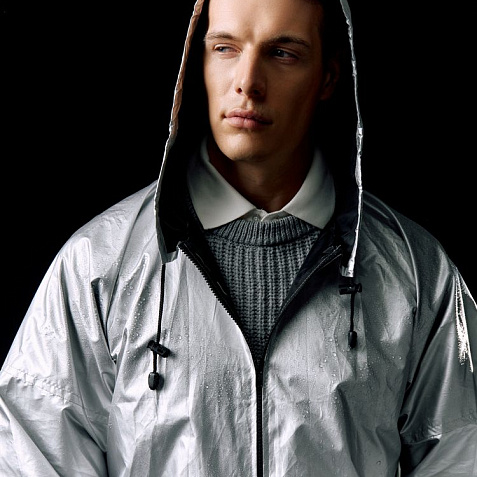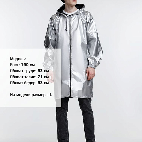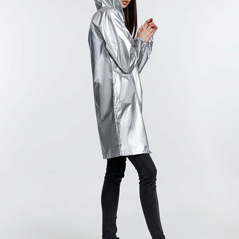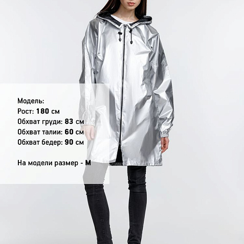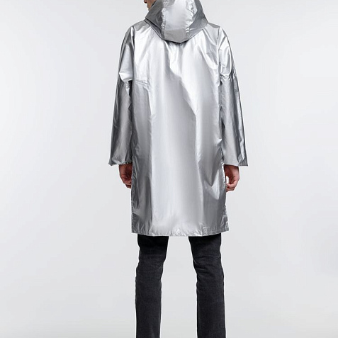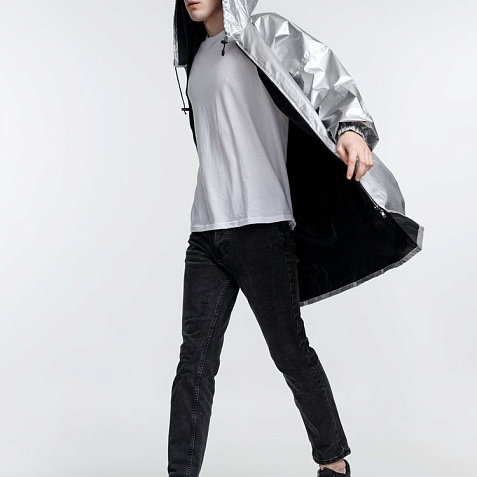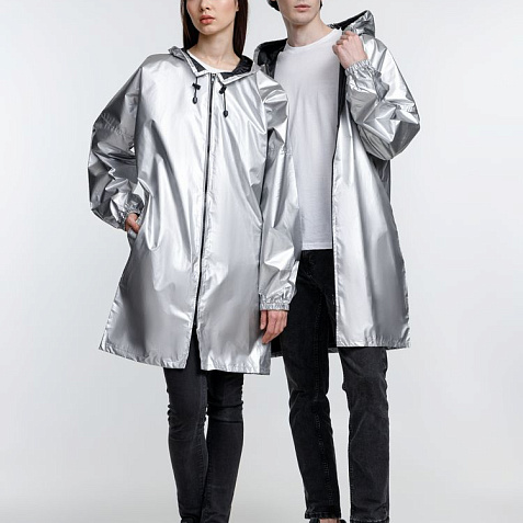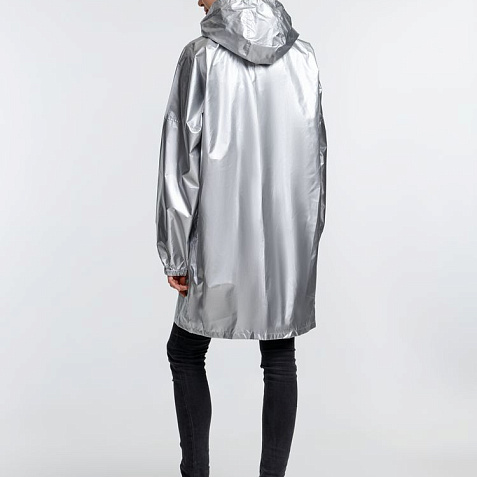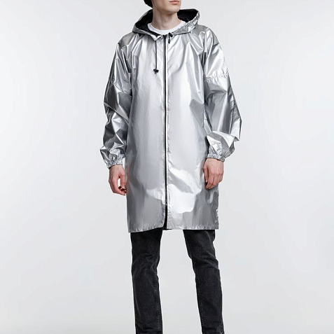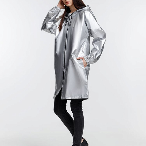 Плащ-дождевик из ткани таффета на молнии с капюшоном. Складывается в мешочек — удобно брать с собой.