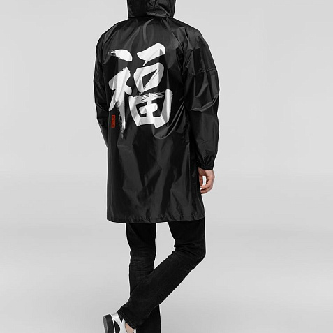 Иероглифы коллекции «Вечные ценности» выполнены в жанре каллиграфии на древнекитайском диалекте мандарин. Плавные линии символизируют внутренний баланс и фокусировку на главных жизненных ориентирах.Плащ-дождевик из ткани таффета на молнии с капюшоном. Складывается в мешочек — удобно брать с собой.