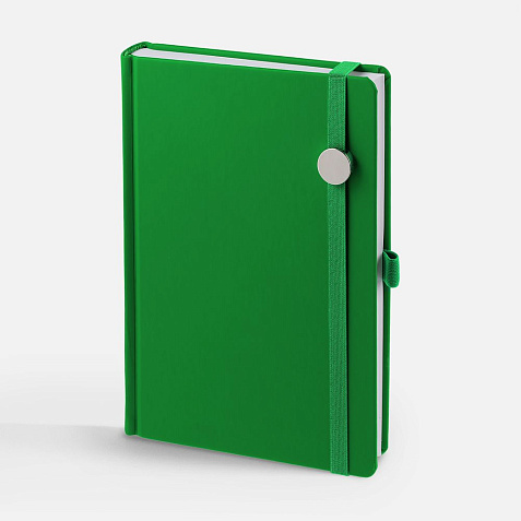 Ежедневник с твердой обложкой без поролона, выполнен из материала Soft Touch Ultra, зеленый FF, дополнен резинкой шириной 1 см, петлей-резинкой для ручки, капталом и ляссе ярко-зеленого цвета.