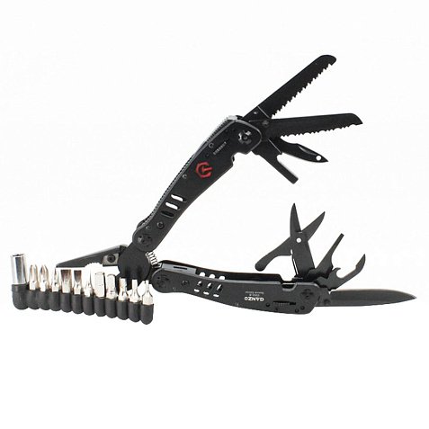 В комплекте мультитул, чехол и набор из 12 съемных бит.