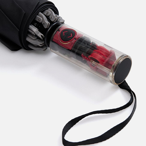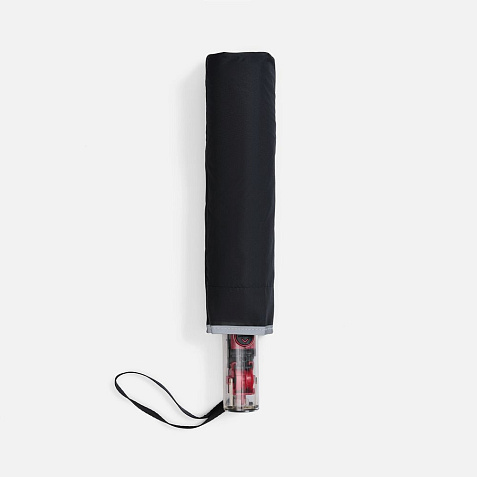 Складной зонт Futurum привлекает внимание оригинальным дизайном. Складываясь после дождя, он прячет мокрую поверхность в себя, а сухая остается снаружи. Светоотражающий кант и ручка из прозрачного пластика, не скрывающая ярких деталей внутри, добавляют внешнему виду зонта футуристичности.