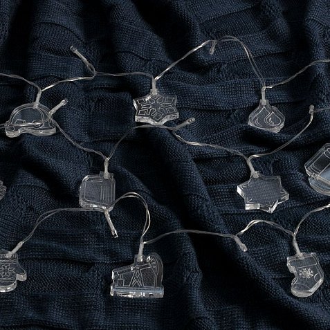 Гирлянда состоит из 20 светодиодов холодного света и 10 акриловых фигурок.