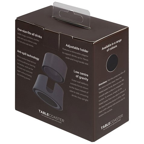 Подставку можно расположить на рабочем столе, прикроватной тумбочке или в машине — в любом месте Tabletop не даст чашке разбиться, а ее содержимому пролиться. Липкое основание конструкции представляет из себя поверхность из множества микроскопических присосок, поэтому уронить и даже сдвинуть подставку с места очень непросто — любимая чашка и клавиатура будут под надежной защитой. Благодаря внутренней вставке подходит для емкостей разного диаметра.