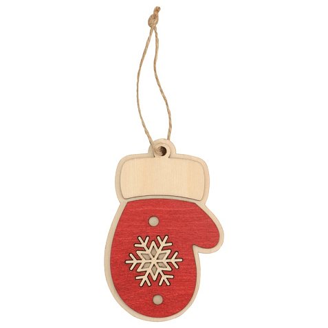 Трогательная елочная игрушка в виде новогодней варежки – атмосферный и праздничный сувенир. Подвеска изготовлена из березовой фанеры и украшена тонировкой красного цвета. Текстура натурального материала и объем игрушки, выполненной в два слоя, делают ее приятной не только внешне, но и тактильно.