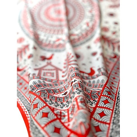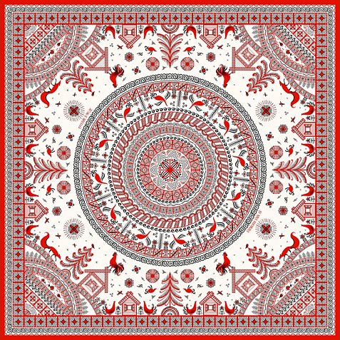 Самобытный орнамент знаменитой мезенской росписи, отличающейся зашифрованным символизмом, лег в основу элегантного платка Мезенская роспись. Петух и лиса. Каждый элемент принта имеет особое значение, и располагается в строго определенном месте, создавая целый рассказ. Ранее такими рисунками украшали избы, посуду и кухонную утварь, передавая послание поколениям. Два народных персонажа, воспетых в старых добрых сказках, хранят в себе мудрость, стремление к свободе и почитание традиций предков. Их часто задействовали в мезенском народном промысле. Лиса — это символ огня и независимости, а петух — солнца и защиты. И ведь это те качества, которыми от природы наделена каждая представительница прекрасного пола. Шелковый аксессуар с красно-черной древней росписью и откликами русской истории гармонично дополнит собой элегантный наряд, станет роскошным оберегом для Вас! Он эффектно завершит образ, расставит недостающие акценты и подчеркнет Вашу уникальную красоту! Автор платка: Ирина Сказка